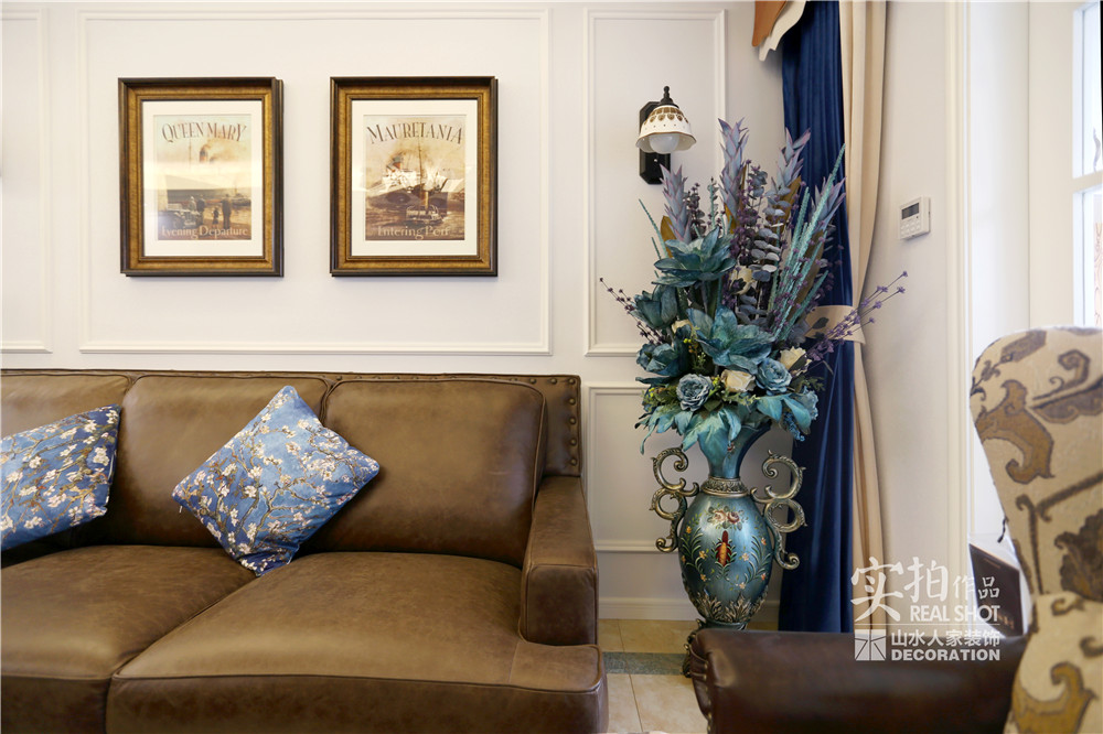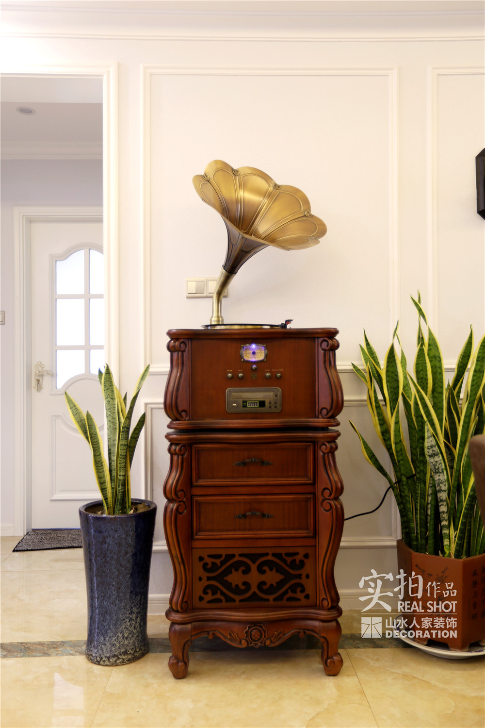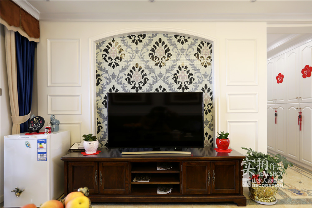 客廳的電視背景墻運用了木質(zhì)墻板,沙發(fā)背景空間用PU線條上墻,做出仿制墻板的感覺,前后呼應(yīng)。這樣做的好處是,既提煉了美式的表現(xiàn)元素,也附帶一些現(xiàn)代氣息,增強時尚感。