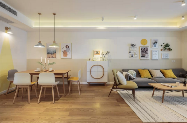 天花板做的平頂造型,盡可能地拉伸層高。無主燈的設計,更是錦上添花,無死角照明,實用又高級。地面通鋪800*800的暖色磚,很好地匹配到客廳的裝飾風格。
