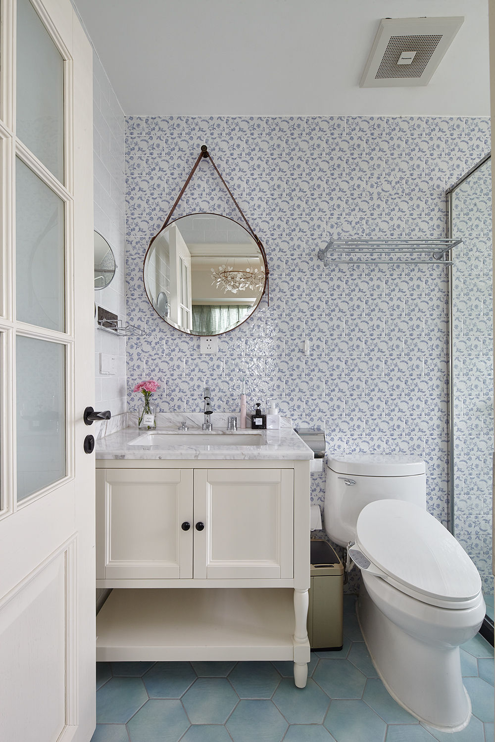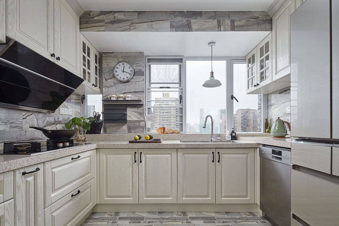 廚房選擇U型櫥柜操作臺,給居家烹飪提供了更多的活動空間。復(fù)古色的瓷磚不僅提升了整體空間質(zhì)感,不規(guī)則鋪貼的手法更凸顯了設(shè)計(jì)感。