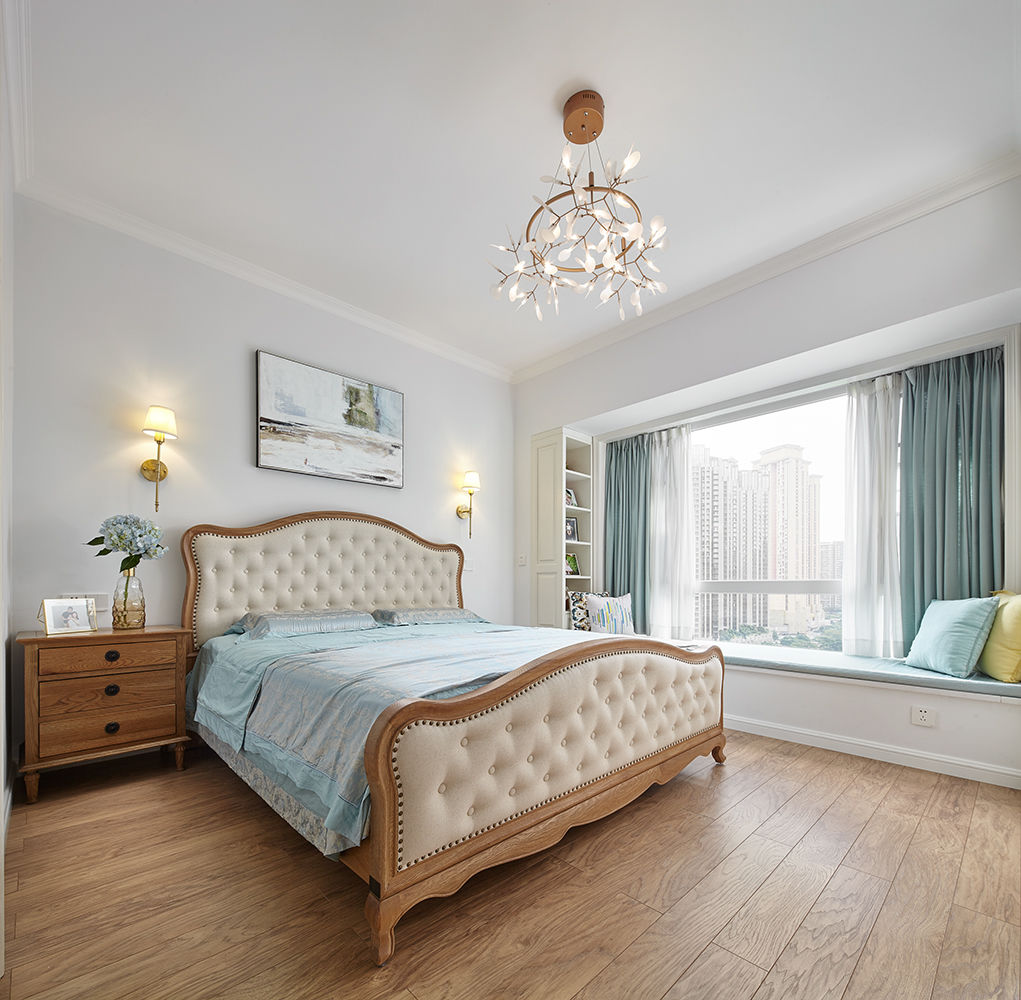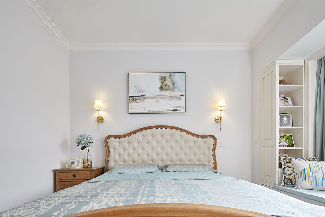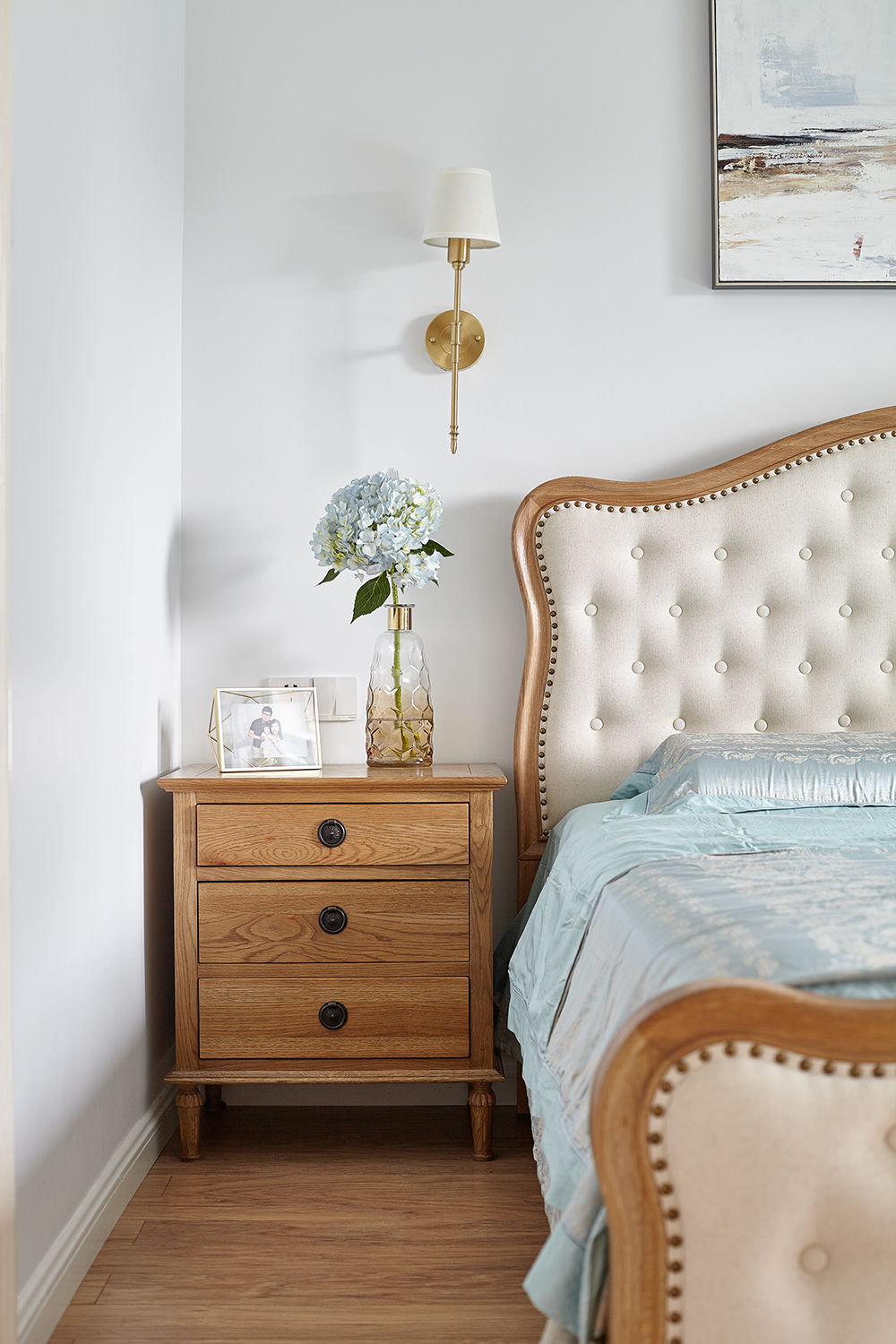 設(shè)計(jì)師用柔和的治愈色系為主臥勾勒出了最雅致且安逸的一筆。頗具藝術(shù)感的吊燈下,粉藍(lán)色輕輕擦過抽象畫的一角,落在優(yōu)雅的繡球花上,落在舒適的大床上,也落在灑滿陽光的飄窗上......
