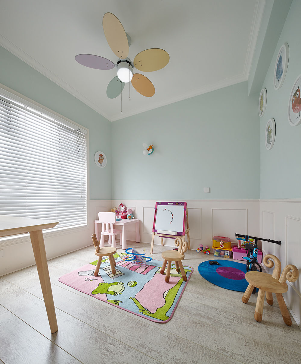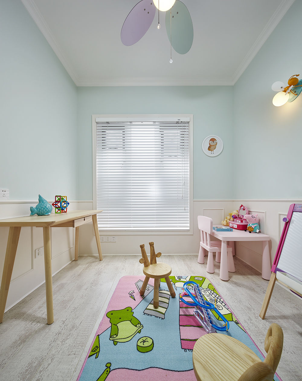兒童房如同童話世界般美好而純真,在粉綠治愈墻面與米色墻裙的包裹中,是愛麗絲仙境般的視覺空間,設(shè)計(jì)師在整體空間布局與色調(diào)把控上更“自然化”,貼近小朋友的視界。
