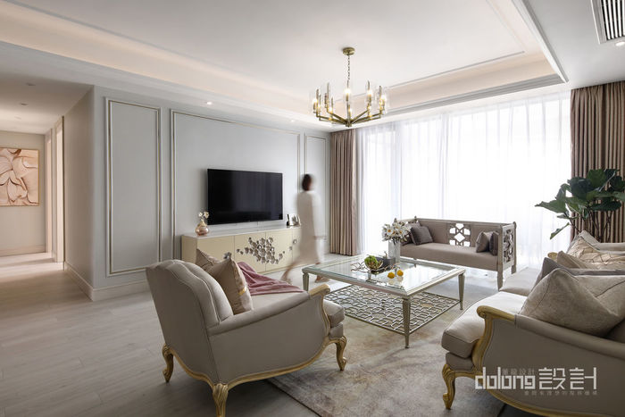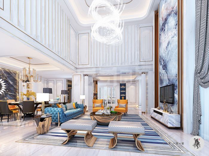 該案例中,中空式的客廳就很適合歐美風(fēng)格,亮堂的廳室配上美式家具,整個客廳墻面鋪上了大理石,其他空白的墻面用金色與石膏線裝飾,盡顯奢華大氣。