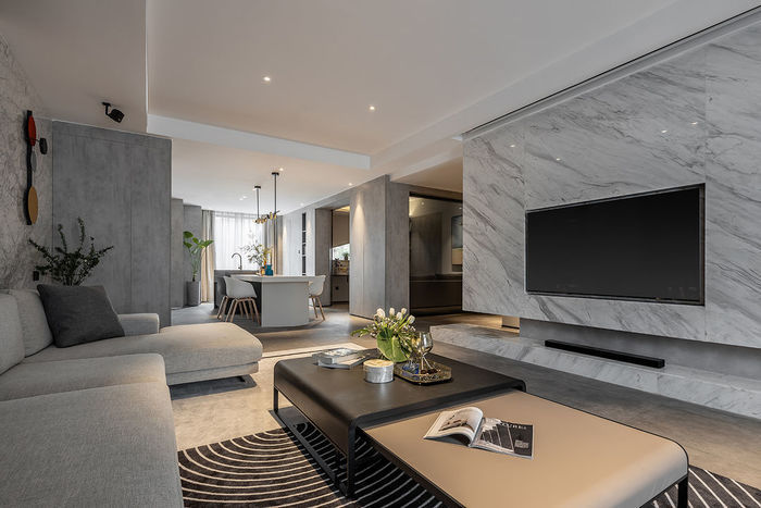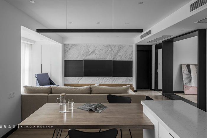 電視墻利用大理石與木材分割錯拼,讓人眼前一亮,而木材的寬度與電視尺寸大小相符,黑色的門框與背景墻相呼應(yīng),與淺色的家具形成了強(qiáng)烈的視覺沖擊性,讓空間質(zhì)感更加明顯。