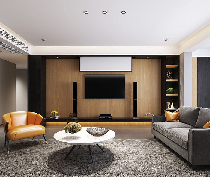 用實木裝飾背景墻,四邊黑色邊框,為背景墻增填色彩,而邊框不止美觀,還有大作用,右邊作置物架,下邊作電視柜,上邊可以收幕布,經(jīng)濟(jì)又實用。