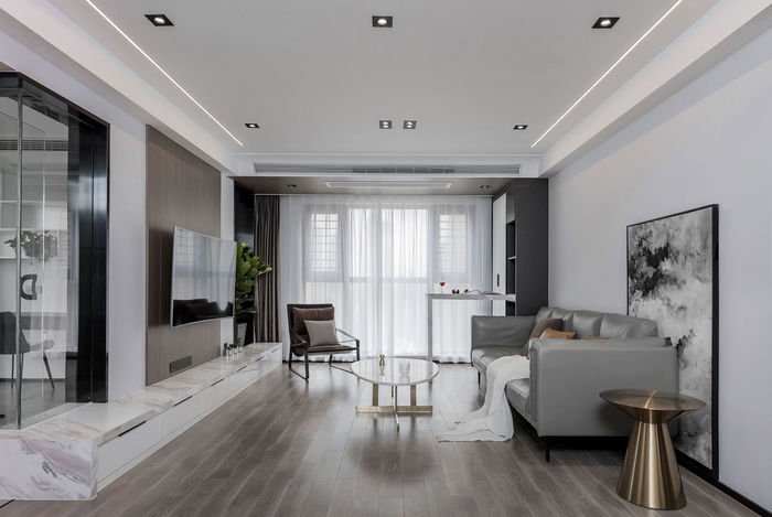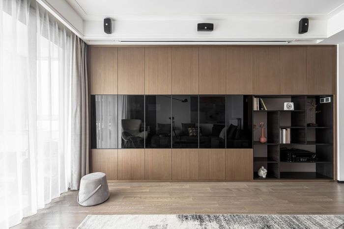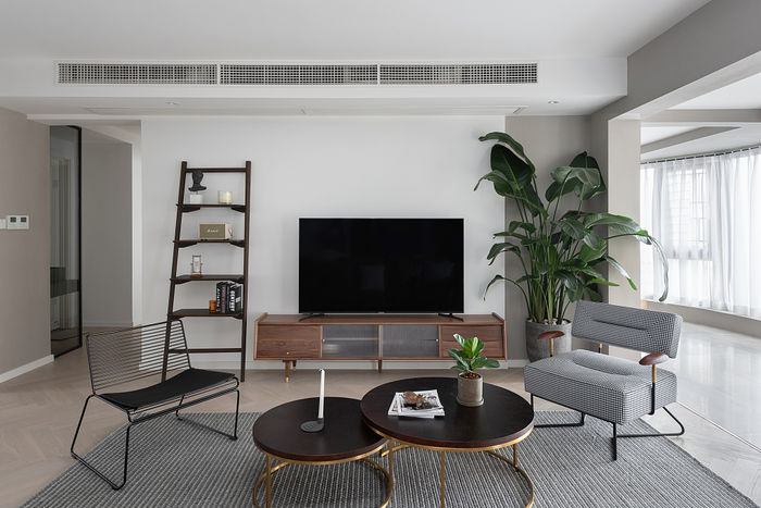 整體色調(diào)以黑白為主,底邊的原木柔和了黑白之間的色調(diào)。整潔的通頂柜電視墻讓人看著很舒服,以收納為主,在灰色低調(diào)中顯示著簡約、自然、輕松的家庭生活。
