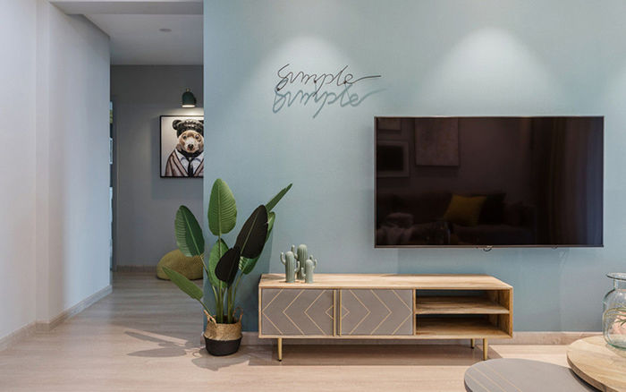 霧霾藍(lán)背景墻,典型的北歐風(fēng)格,搭配原木茶幾和電視柜,很有小清新的感覺。墻上懸掛的藝術(shù)字母、綠植、仙人掌擺件,處處都增添了空間的靈動性。