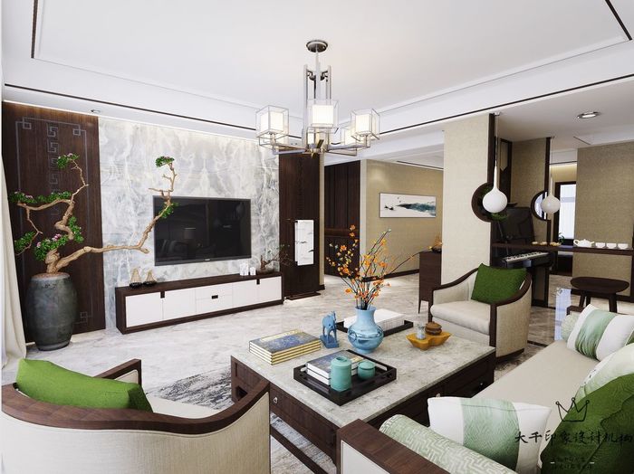 從整體來看,這個裝修風(fēng)格是偏雅靜,不管是墻面、地板還是家具,都選用了灰色系的,為了整體搭配,背景墻選用了同色系、中式水墨畫元素的的大理石材質(zhì),在光源的中和下,為空間了增添了溫馨感。
