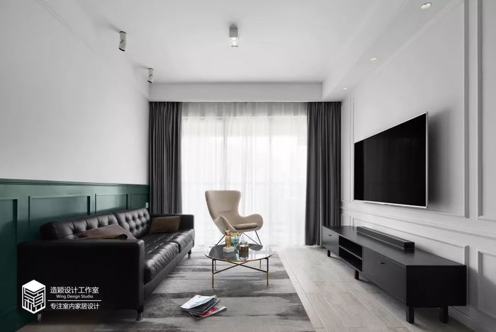 電視背景墻與沙發(fā)背景墻相對應(yīng),利用墨綠色稍稍加以點綴,竟與線條完美組合。家具的配色優(yōu)雅而不張揚(yáng),高端而不夸張。